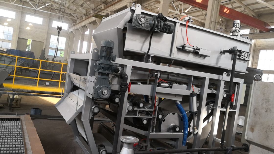 Sprzęt składa się głównie z gęstniacza pasa i maszyny odwodniającej..Pod wpływem grawitacji ścieki przepływają do sekcji odwodniania grawitacyjnego.wchodzi do zbiornika zbiornika wody, a następnie jest kierowany przez kształt klinia sekcji przedkompresyjnej, tak aby osad stopniowo wyrównany i lekko wyciskany w celu dalszego odwodnienia,Następnie wprowadza się do wielowalca w kształcie S w sekcji tłoczenia., osad zostaje umieszczony między górną i dolną tkaniną filtracyjną i wielokrotnie ściskiwany przez kilka szprów o różnej średnicy.osad jest obcięty i osad jest dalej odwodniany w celu utworzenia ciasta błotowegoWreszcie osad jest usuwany za pomocą szkraby, ciasto jest zrywane i transportowane, a górne i dolne pasy filtrujące są myte i następnie ponownie wykorzystywane.